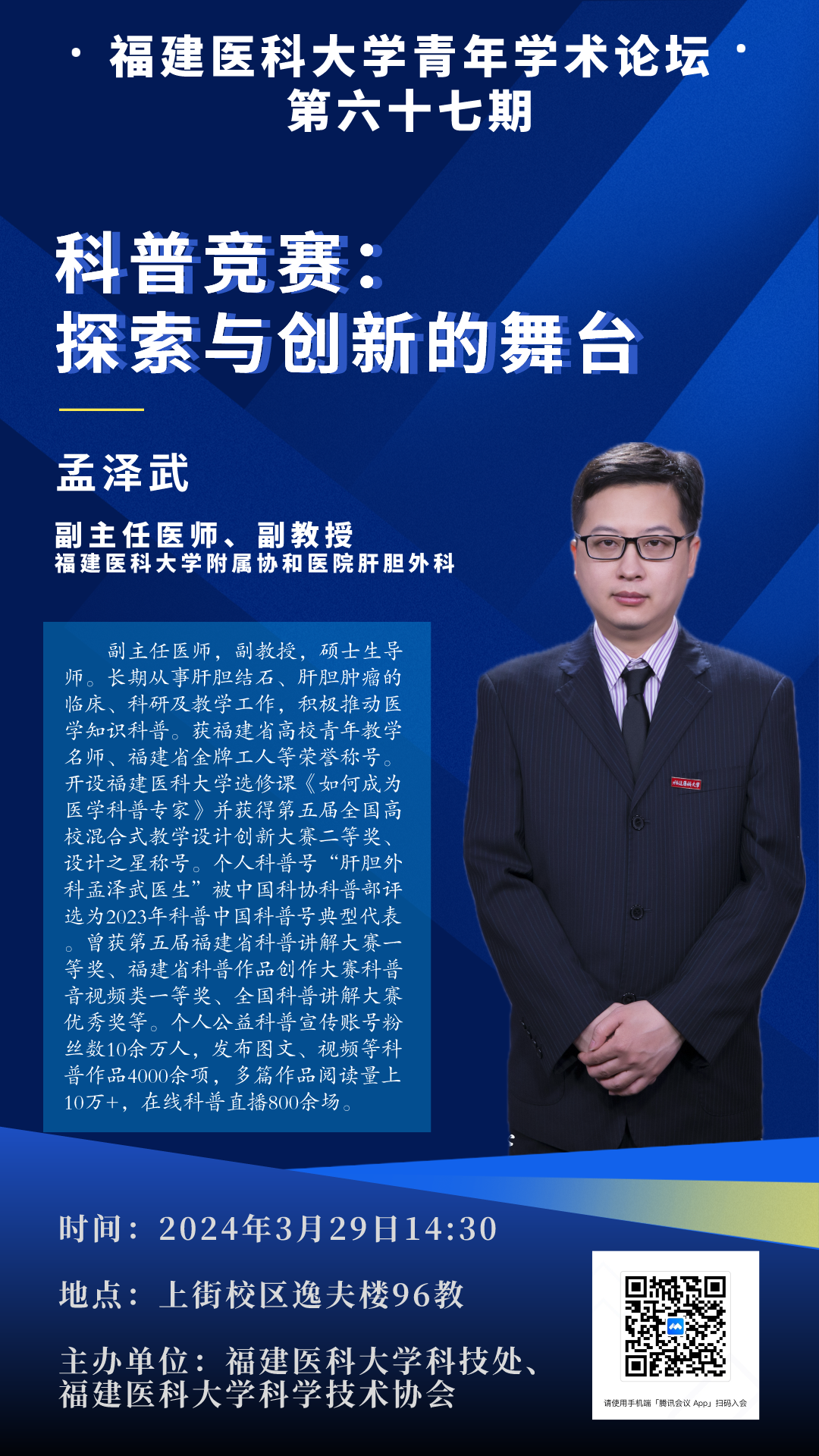 孟泽武,副主任医师,副教授,硕士生导师。任职于亚洲中文精品乱码附属协和医院肝胆外科,长期从事肝胆结石、肝胆肿瘤的临床、科研及教学工作,积极推动医学知识科普。获福建省高校青年教学名师、福建省金牌工人等荣誉称号。开设亚洲中文精品乱码选修课《如何成为医学科普专家》并获得第五届全国高校混合式教学设计创新大赛二等奖、设计之星称号。个人科普号“肝胆外科孟泽武医生”被中国科协科普部评选为2023年科普中国科普号典型代表。曾获第五届福建省科普讲解大赛一等奖、福建省科普作品创作大赛科普音视频类一等奖、全国科普讲解大赛优秀奖等。个人公益科普宣传账号粉丝数10余万人,发布图文、视频等科普作品4000余项,多篇作品阅读量上10万+,在线科普直播800余场。